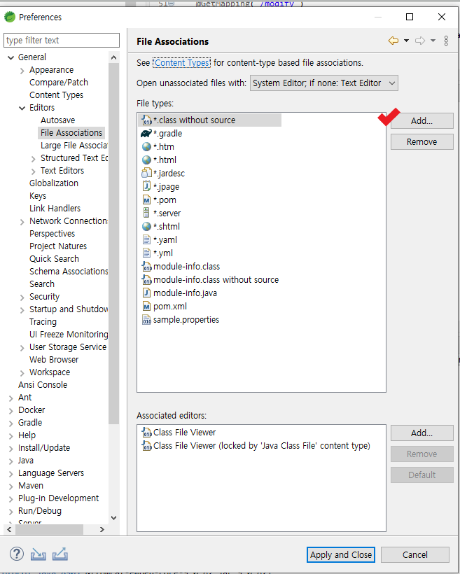 그런 다음 추가 된 *.jsp 파일을 클릭 한 상태에서 하단의 Associated editors 우측의 add를 클릭해서 java editor를 클릭해 준 다음 apply and close 해 주면 eclipse에서도 jsp파일이 열린다.
