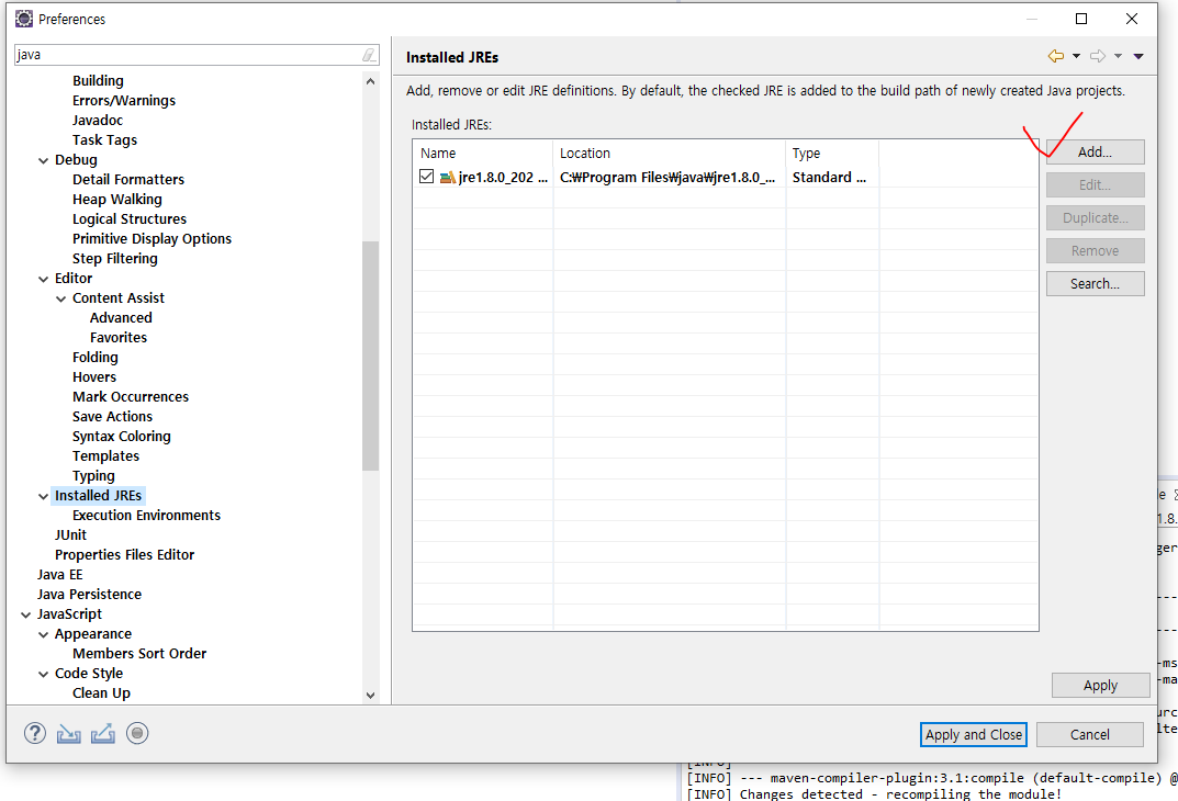 add 눌러서 jdk 추가 해 준 다음 apply 그리고 maven build 진행 하면
