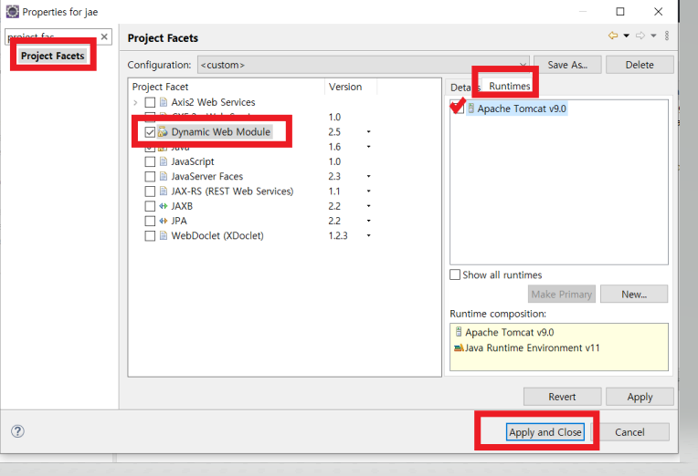ektl properties에서 project facets > dynamic web module > runtimes > server 선택 >apply