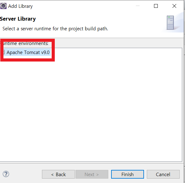 server 클릭 >finish > apply