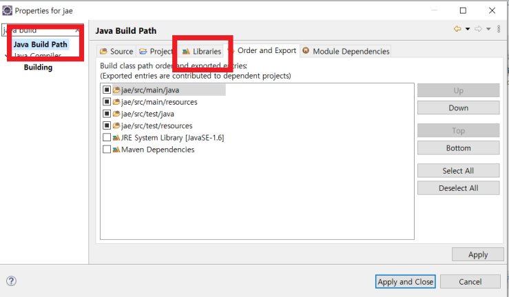 해당 프로젝트 마우스 우클릭 > properties 선택 > java build path > libraries