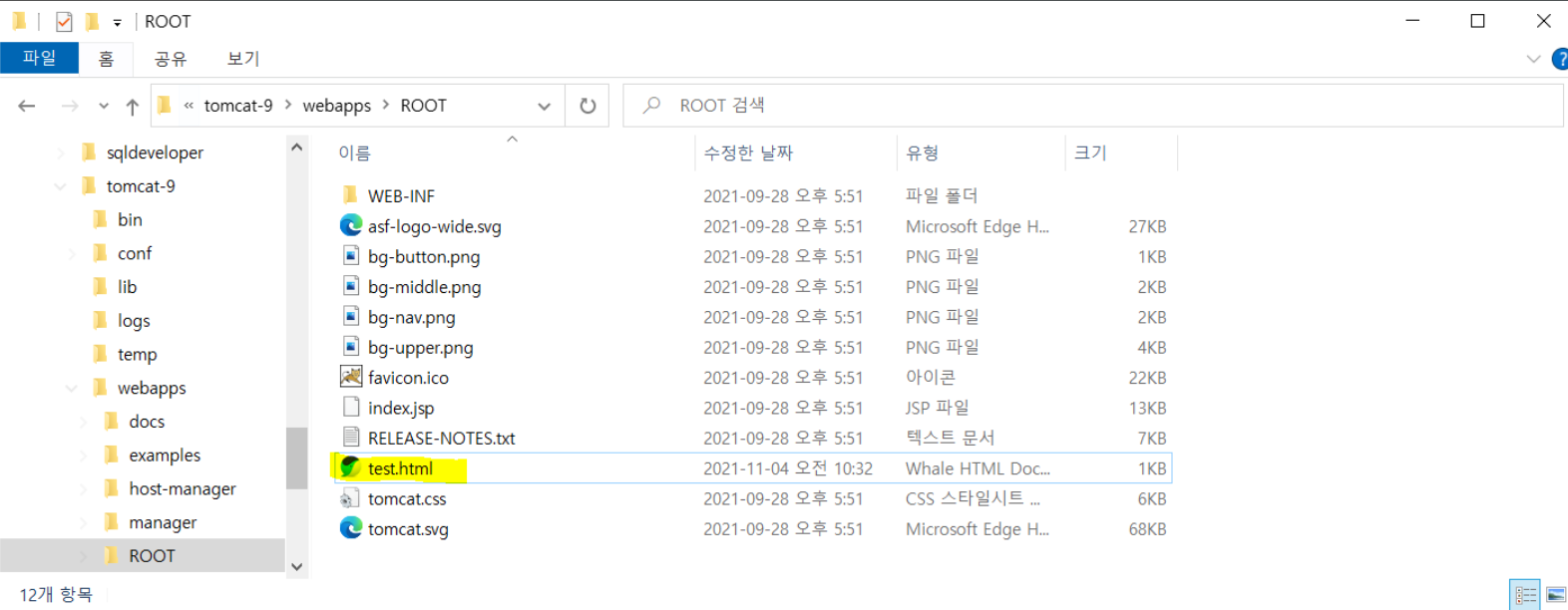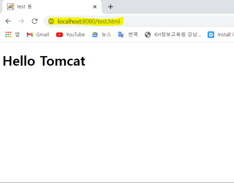바꾼 파일을 VSCODE에서 출력 문구 작성 후 아까 톰캣홈페이지에서 주고 뒤에 /test.html (지정한 파일 명)을 추가 해 주면 VSCODE에서 작성 한 문구가 출력 된다.