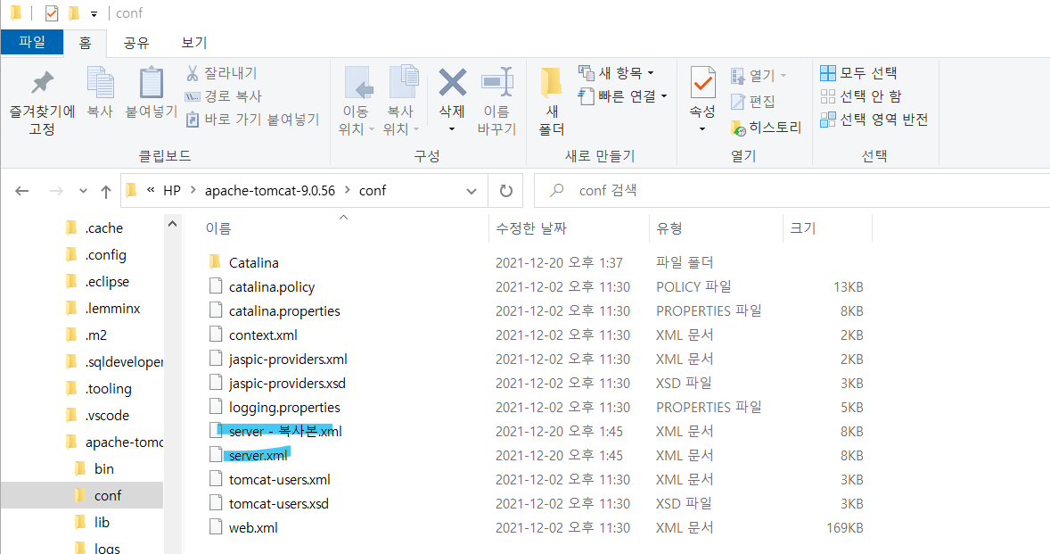 server.xml 파일을 그냥 쓰면 망가질수도 있으니 우선 복사본을 만들고 원본 파일에 작업을 해 본다.