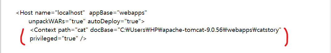 <Context path="cat" docBase="C:\Users\HP\apache-tomcat-9.0.56\webapps\catstory"
