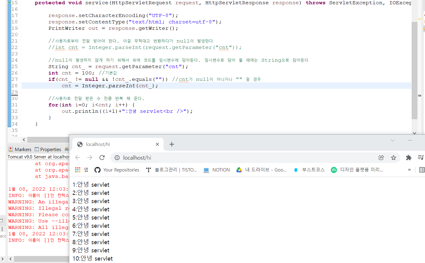 response.setCharacterEncoding("UTF-8"); response.setContentType("text/html; charset=utf-8"); PrintWriter out = response.getWriter(); //사용자로부터 전달 받아야 한다. 이걸 무턱대고 반환하다가 null이 발생한다 //int cnt = Integer.parseInt(request.getParameter("cnt")); //null이 발생하지 않게 하기 위해서 위에 코드를 임시변수에 담아둔다. 임시변수로 담아 둘 때에는 String으로 담아둔다 String cnt_ = request.getParameter("cnt"); int cnt = 100; //기본값 if(cnt_ != null && !cnt_.equals("")) //cnt가 null이 아니거나 "" 일 경우 cnt = Integer.parseInt(cnt_); //사용자로 전달 받은 수 만큼 반복 해 준다. for(int i=0; i<cnt; i++) { out.println((i+1)+":안녕 servlet<br />"); } }처음에는 요청이 없기 떄문에 기본값 100번이 반복이 된다.