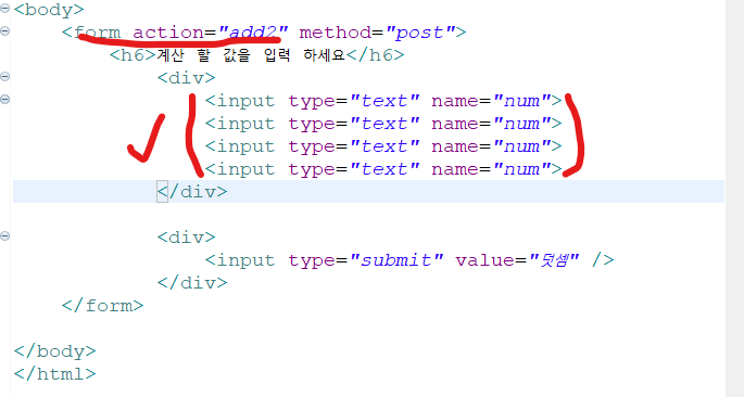 String[] num_ = request.getParameterValues("num"); //_을 붙이는 이름은 임시로 사용하기 위해 //동일한 이름이 여러개 올 때는 getParameterVlues로 int result = 0; // 그리고 기본값을 설정 해 준다. //그리고 반복문 작성 for(int i =0; i<num_.length; i++) { int num = Integer.parseInt(num_[i]); //문자열->정수로 형변환을 선언 해 준다. for문 안에서 연산이 아니라 선언이 아니기때문에 반복하기 전에 먼저 만들어져야 한번만 만들어지고 선언이 반복되는 일이 없다. 지역적으로만 쓰기 위해 for문안에 작성해주고 지역변수로 사용하는 것이다. result+=num; //[i]를 넣어줘서 그때그때 하나씩 바뀌게 될 것이다. } //result에 num값을 누적시켜준다. response.getWriter().printf(" 값 : %d\n", result);// 포멧팅 해서 출력 해준다.배열로 받아올때는 request.getParameter가 아니라request.getParameterValues()로 요청 해줘야 한다.