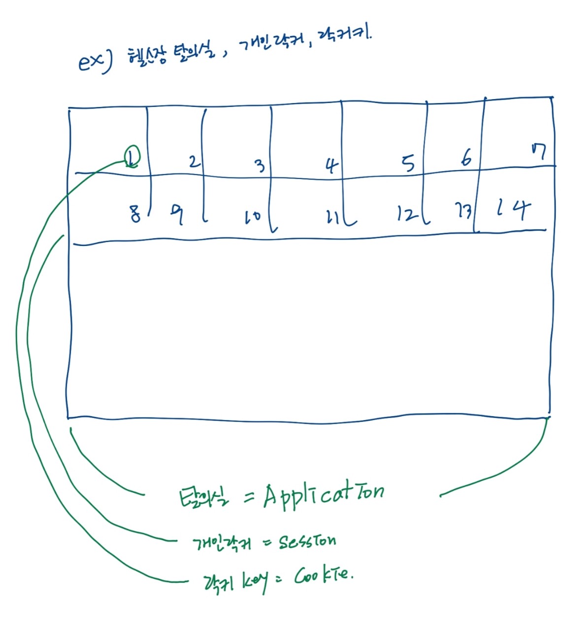 application은 다 같이 이용하는 공용탈의실, session은 개인이 사용 할 수 있는 락커 공간 그리고 cookie는 지니고 다닐 수 있는 락커 키 라고 생각해보면 좀 더 이해가 쉽게 될 것이다 .