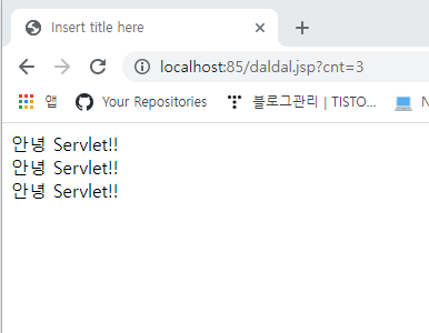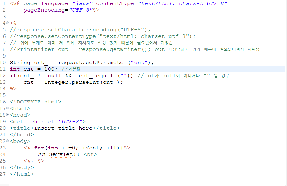 전에 만들었던 파일처럼 반복문을 통해 안녕 Servlet!!을 10번 출력하고 싶다 하면