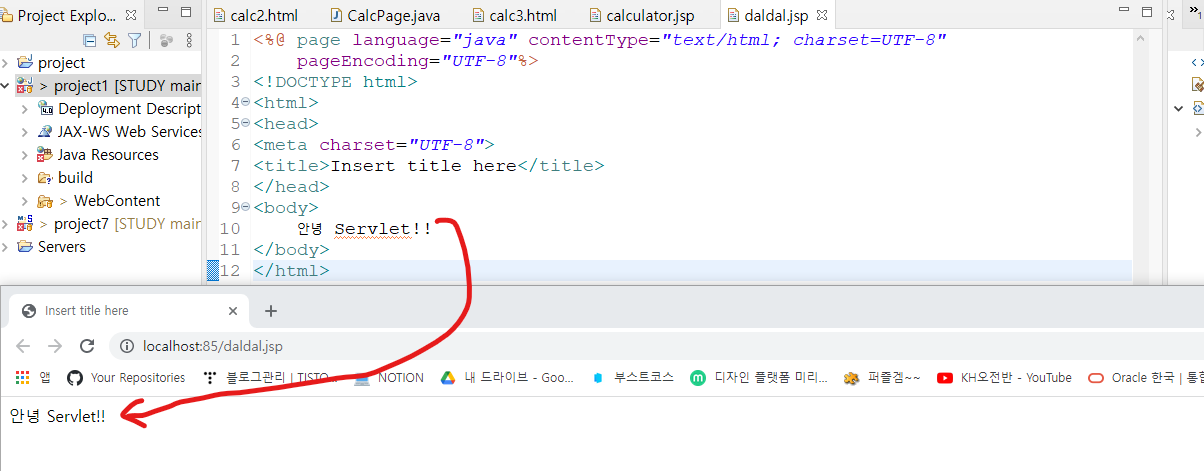 이라고 코드를 넣어줬다고 하면 jsp 파일에서는 그냥 안녕 Servlet!!만 작성 해도 출력이 된다.