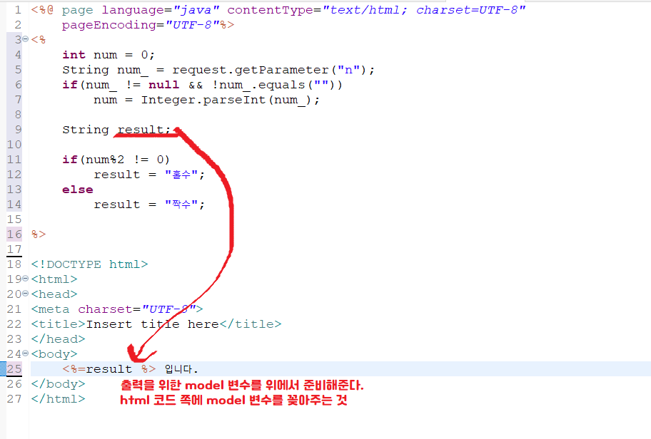 <%@ page language="java" contentType="text/html; charset=UTF-8" pageEncoding="UTF-8"%> <!------------------------ 입력 코드 --------------------------> <% String num_ = request.getParameter("n"); %> <!------------------------ 출력 코드 --------------------------> <!DOCTYPE html> <html> <head> <meta charset="UTF-8"> <title>Insert title here</title> </head> <body> <% if(num%2 != 0){ %> 홀수입니다. <% } else{ %> 짝수입니다. <%} %> </body> </html>기존에 이러했던 코드를 mvc model방식을 통해서 수정하게 되면