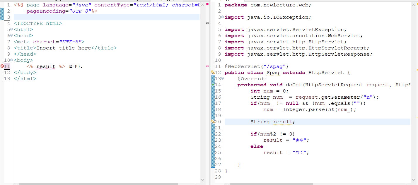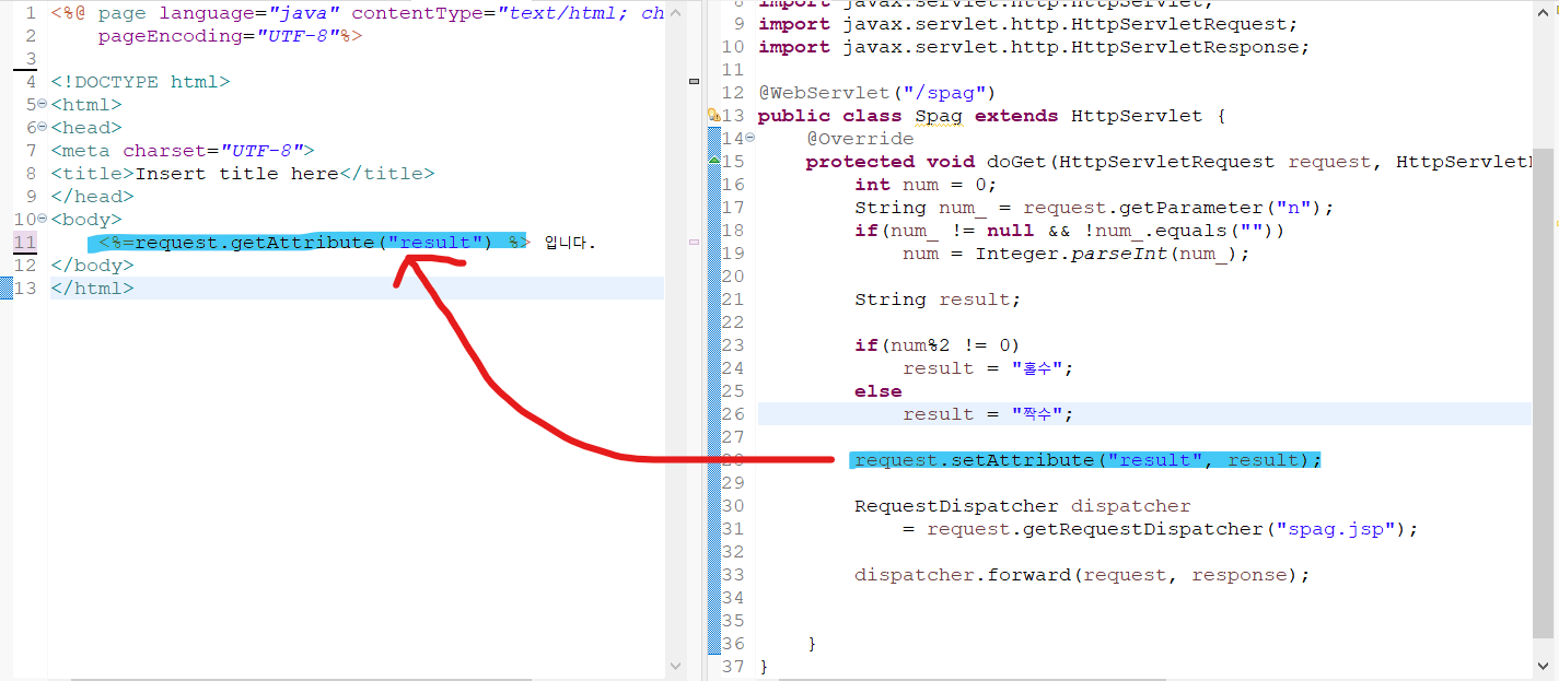 request.setAttribute("result", result); RequestDispatcher dispatcher = request.getRequestDispatcher("spag.jsp"); dispatcher.forward(request, response);request.setAttribute를 사용해서 연결하고자 하는 값을 담아 주면 된다.