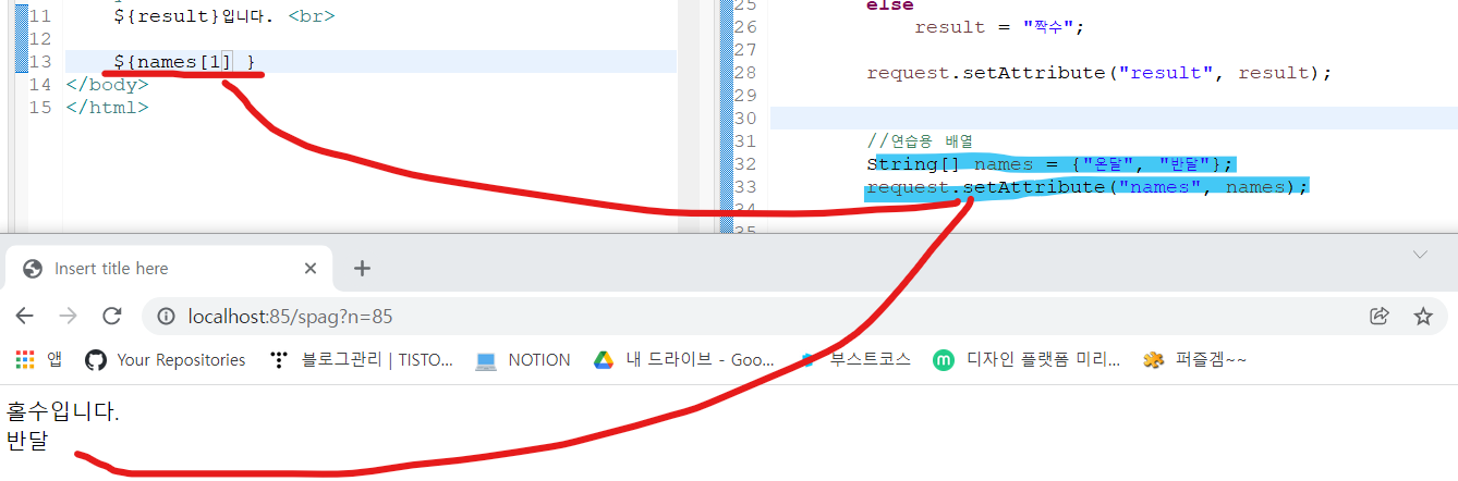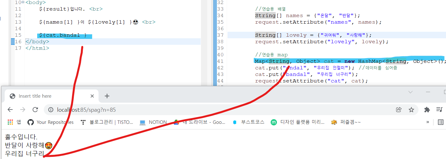 Map n = new HashMap("title", "제목"); request.setAttribute("n", n); 👇 ((Map)request.getAttribute("n")).get("title") 이런식으로 코드블럭을 작성해줬다면 EL을 사용하면 👇 ${n.title} 로 간단하게 꺼낼 수 있다코드로 연습을 해보면