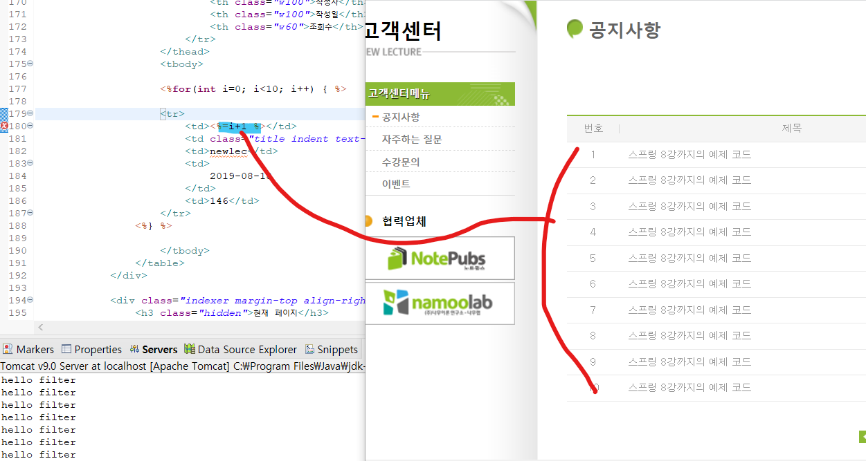 원래대로 코드블럭을 넣어준다 하면 <% out.print(i+1);%> 이런식으로 작성 해 주어야 한다.