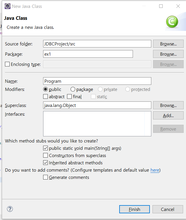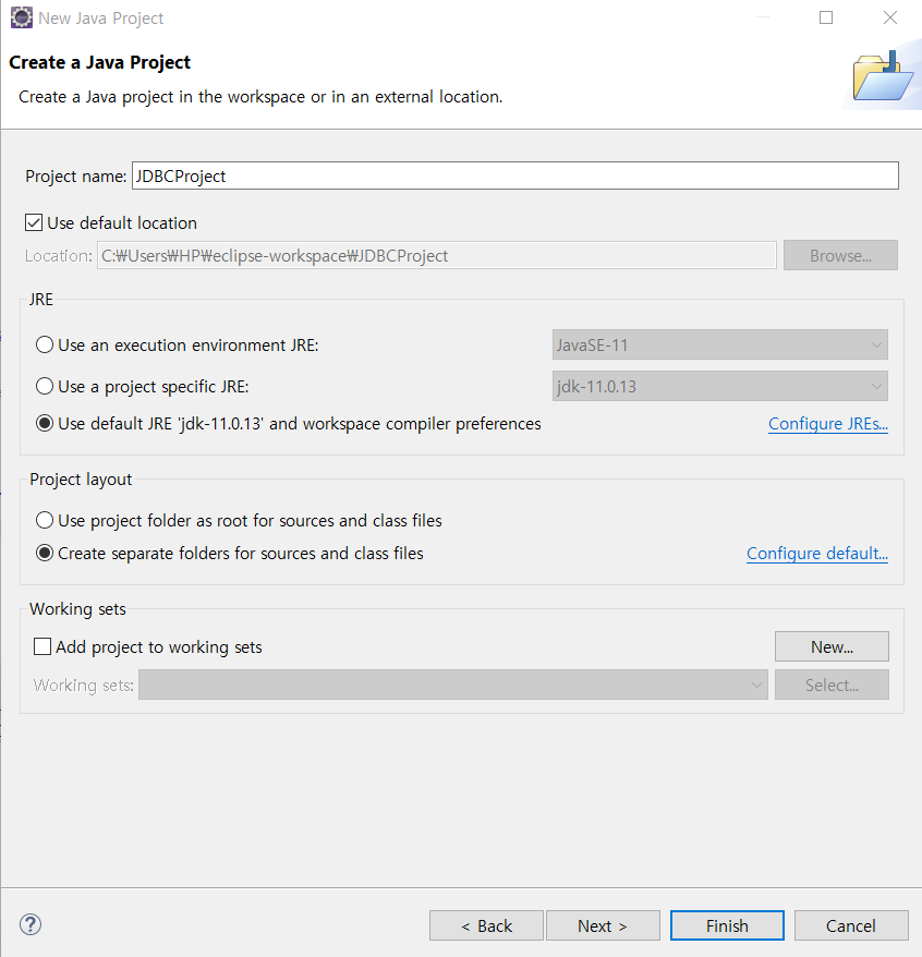 이것을 이용하기 위해 프로젝트를 하나 만들어 준다. 자바프로젝트로 이름은 JDBCProject로 만든다