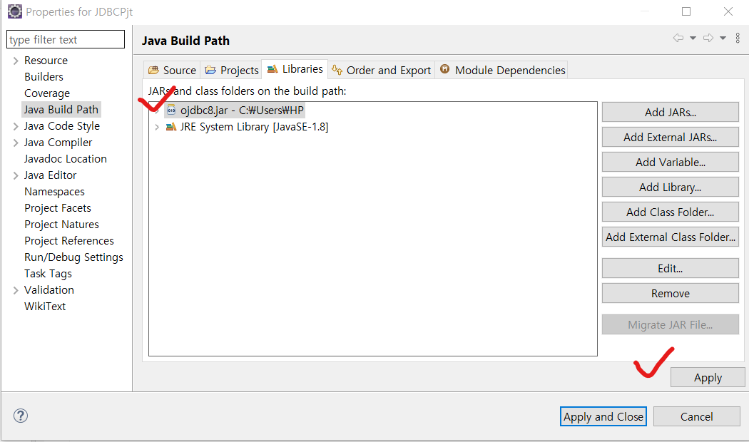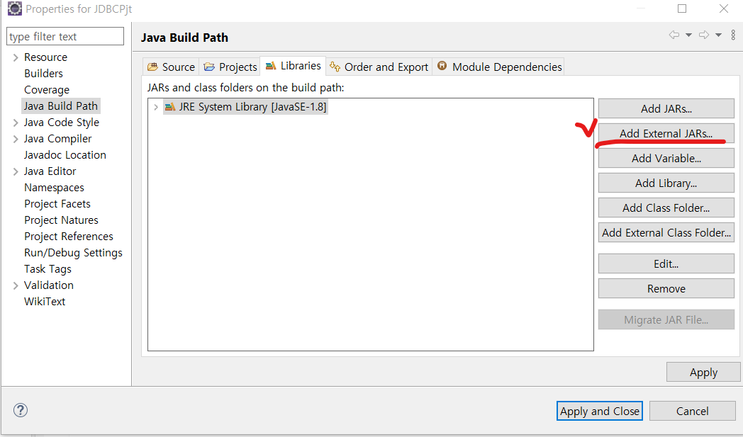 여기에 아까 다운받은 jar 라이브러리 추가해주기