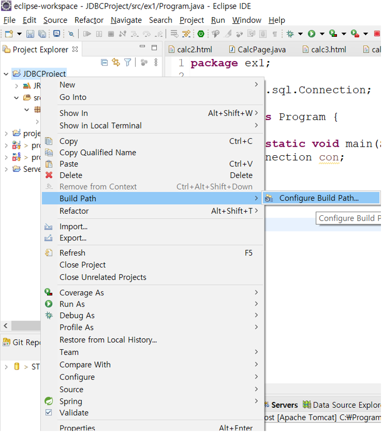 프로젝트 마우스 우클릭->build path->configure build path 클릭