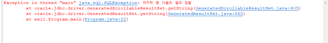 String url = "jdbc:oracle:thin:@localhost:1521/xepdb1"; String sql = "SELECT * FROM NOTICE"; Class.forName("oracle.jdbc.driver.OracleDriver"); Connection con = DriverManager.getConnection(url,"sys as sysdba", "비밀번호"); Statement st = con. createStatement(); ResultSet rs = st.executeQuery(sql); rs.next(); //다음으로 넘어가기 String title = rs.getString("TITLE"); //title이라는 컬럼명을 조회 System.out.println(title); //제대로 가져와지는지 출력문으로 확인해보기 rs.close(); st.close(); con.close();빨간줄이 뜨는 것들은 예외처리를 위해 다 던져준다.