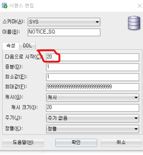그러면 시퀀스랑 충돌하게 되기 때문에 LAST값을 변경해주기로 하자.