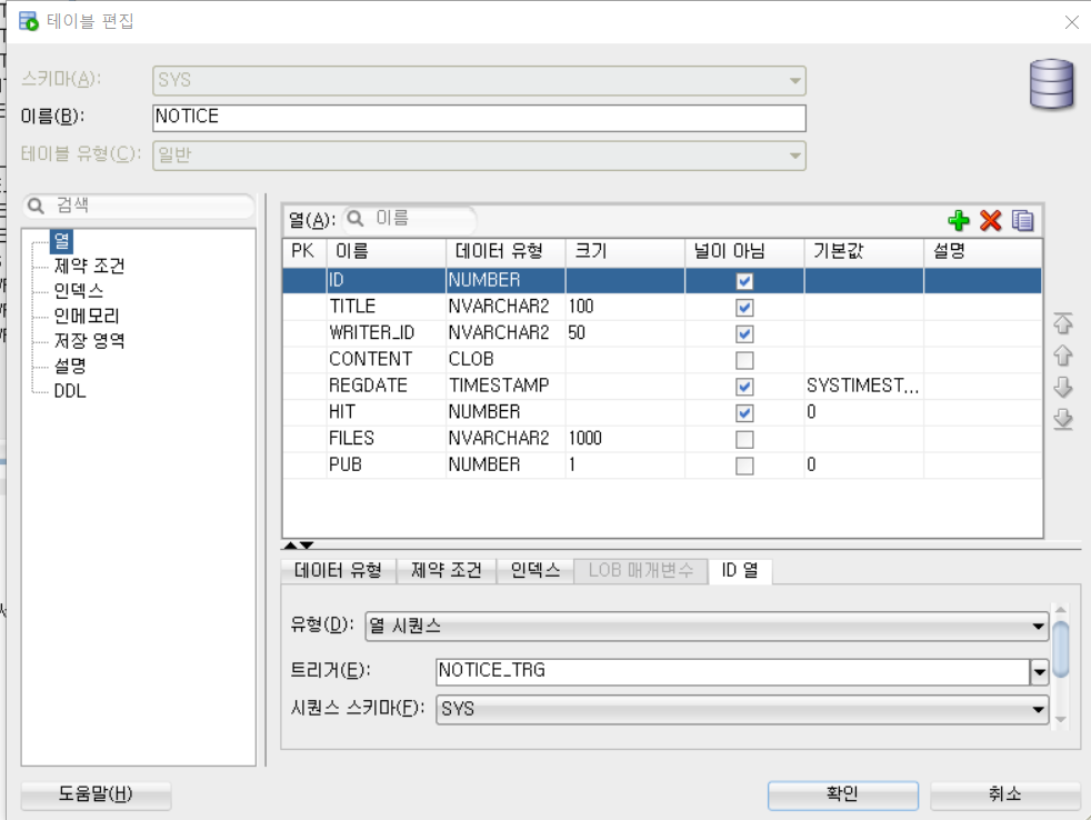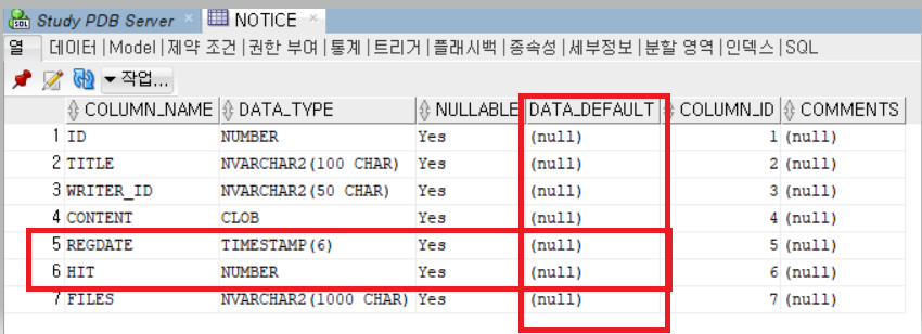 박스표시한 부분에서 DATA_DEPAULT 부분의 값을 기본값으로 설정해줄수 있는데 HIT의 경우에는 0으로 REGDATE의 경우에는 SYSTIMESTAMP로 설정해줄수있다.
