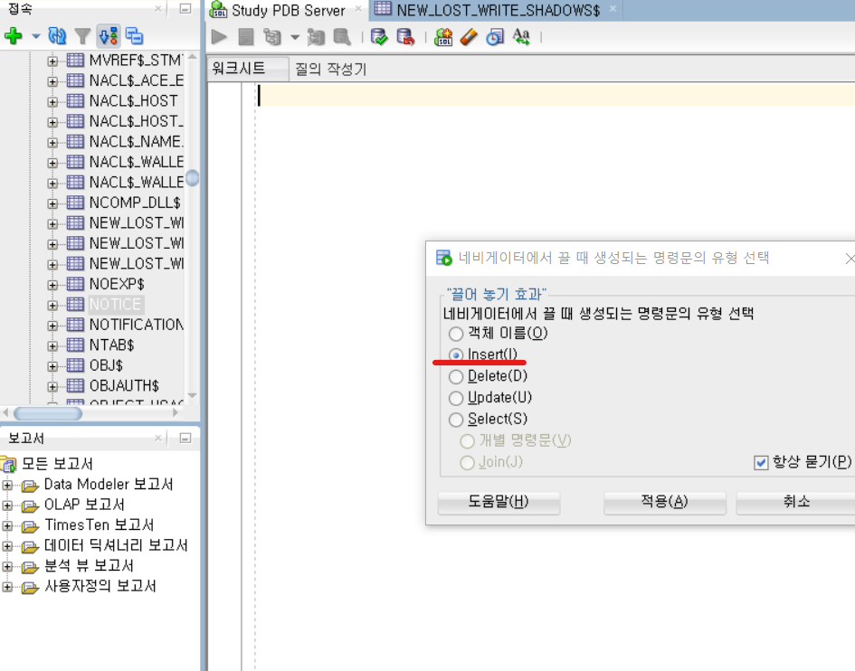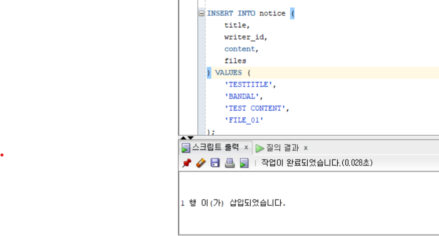 NOTICE라는 테이블에 값을 입력하기 위해 입력문을 만들어야하는데. NOTICE를 입력창에 드래그하면 자동으로 입력문을 작성 해 준다.