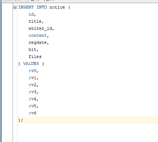 이제 사용자 값이 들어가지 않으면서 값이 들어 갈 수 있도록 하는 컬럼 HIT, PUB,REGDATE,ID 들은 아까 테이블 드레그 해서 만든 INSERT문에서 지워준다.