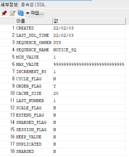 MINVALUE 최소값을 설정하는거고 NOMINVALUE은 최소값 설정을 하지 않는 것이다.CACHE는 시퀀스를 빨리 제공하기 위해 메모리에 캐쉬 되는 값을 정하는 것이고 기본값은 20이다. NOORDER가 기본값이고 만들어진 순서대로 병렬을 원할 경우 ORDER로 작성하면 된다.NOCYCLE이 기본값이며 CYCLE로 하면 지정MAX값에 도달 했을 경우 다시 MIN값으로 돌아가게된다.