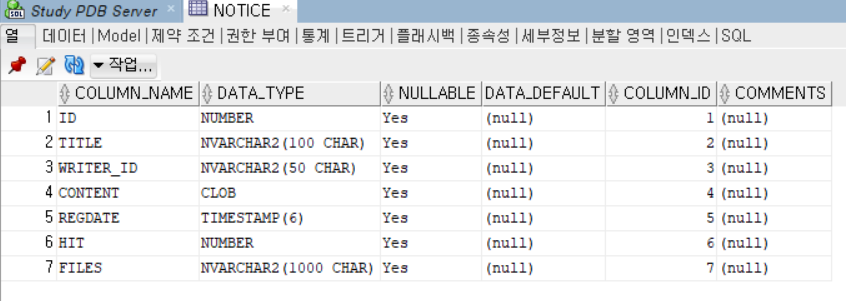 왼쪽에서 NOTICE테이블을 클릭해서 선택하면