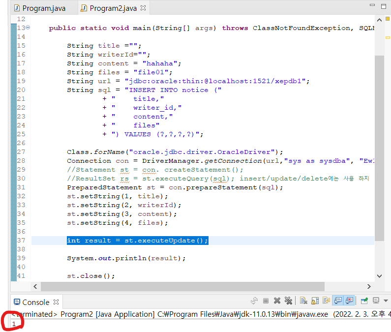 그리고 insert가 제대로 된다면 콘솔창에 1이라는 값이 뜰 것이다. 그럼 그 결과값을 int로 담아줘야한다,