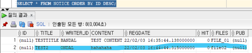 public static void main(String[] args) throws ClassNotFoundException, SQLException { String url = "jdbc:oracle:thin:@localhost:1521/xepdb1"; String sql = "INSERT INTO notice (" + " title," + " writer_id," + " content," + " files" + ") VALUES (" + " 'TESTTITLE'," + " 'BANDAL'," + " 'TEST CONTENT'," + " 'FILE_01'" + ")"; Class.forName("oracle.jdbc.driver.OracleDriver"); Connection con = DriverManager.getConnection(url,"sys as sysdba", "Ew170916!!"); Statement st = con. createStatement(); //ResultSet rs = st.executeQuery(sql); insert/update/delete에는 사용 하지 않는다. st.close(); con.close(); } }그럼 이렇게 깔끔하게 지워진 것을 확인 할 수 있다.