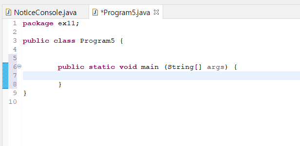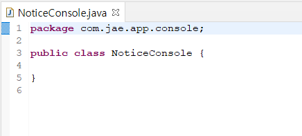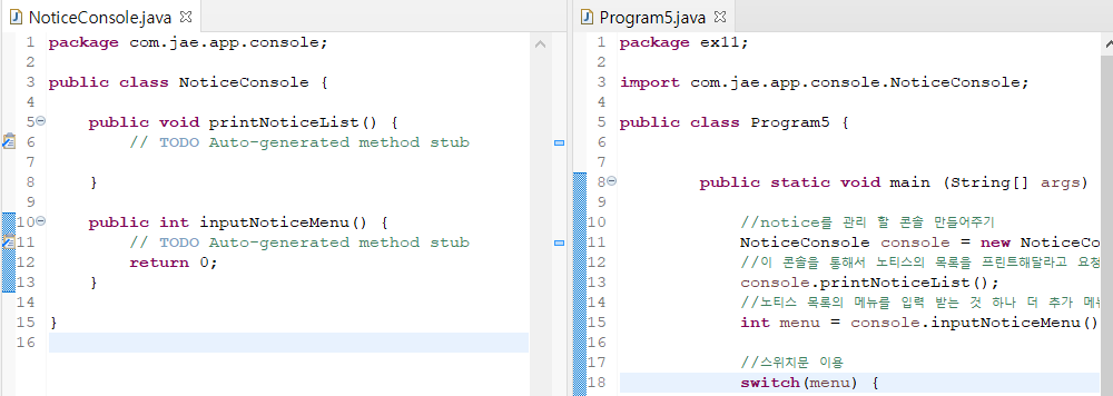 package ex11; import com.jae.app.console.NoticeConsole; public class Program5 { public static void main (String[] args) { //notice를 관리 할 콘솔 만들어주기 NoticeConsole console = new NoticeConsole(); //이 콘솔을 통해서 노티스의 목록을 프린트해달라고 요청하기 console.printNoticeList(); //노티스 목록의 메뉴를 입력 받는 것 하나 더 추가 메뉴를 입력받아야함 int menu = console.inputNoticeMenu(); //스위치문 이용 switch(menu) { //상세조회 case 1: break; //이전 case 2: break; //다음 case 3: break; //글쓰기 case 4: break; } } }만들어주고 noticeconsole에다가 program5에서 만든것들을 생성 해 준다.