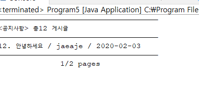 public class NoticeConsole { //출력 구현하기 위한 데이터를 가지고 있어야함 //그래서 여기에 noticeservice 만들어줌 private NoticeService service; public NoticeConsole() { service = new NoticeService(); } public void printNoticeList() throws ClassNotFoundException, SQLException { //list를 얻어준다. 서비스가 제공하고 있는 리스트 목록을 얻어서 출력 할 것 //예외처리 던져준다. List<Notice> list = service.getList(); System.out.println("────────────────────────────────────"); //여기서 생성해달라고 해야함 System.out.printf("<공지사항> 총%d 게시글\n", 12); System.out.println("────────────────────────────────────"); //여기는 반복되어야한니깐 foreach문 사용 for(Notice n : list) { System.out.printf("%d. %s / %s / %s\n", n.getId(), n.getTitle(), n.getWriterId(), n.getRegDate()); } System.out.println("────────────────────────────────────"); System.out.printf(" %d/%d pages\n", 1, 2); } public int inputNoticeMenu() { return 0; } }이렇게 출력이 된다.