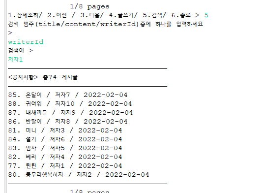5번검색기능이 나타났다 5번을 입력하면 범주를 입력하라고 뜨고 저자1을 검색해보았다.