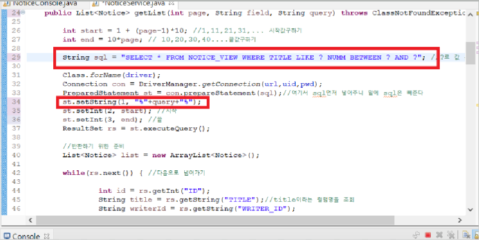 SELECT * FROM NOTICE_VIEW WHERE "+field+" LIKE ? AND NUMM BETEEWN ? AND ? 로 쿼리를 작성해주고
