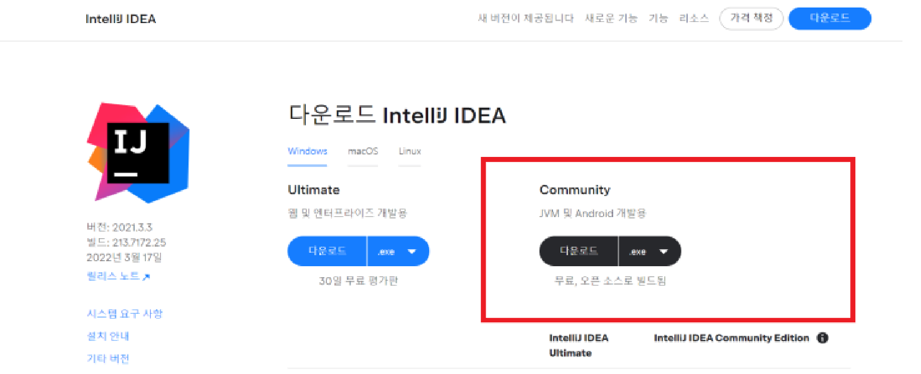 https://www.jetbrains.com/ko-kr/idea/download/#section=windows