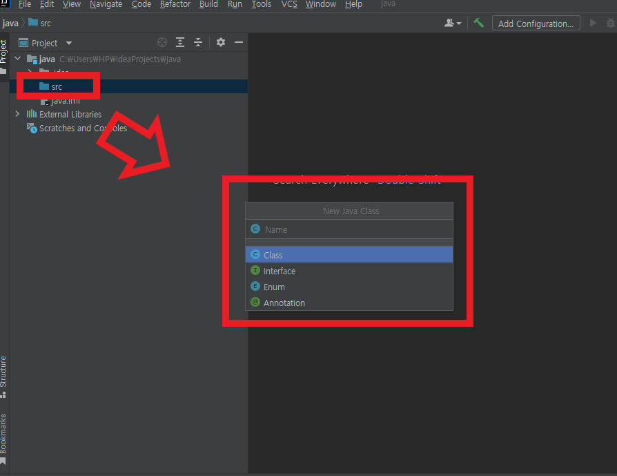 src 폴더 마우스 우클릭 -> new -> java class 클릭
