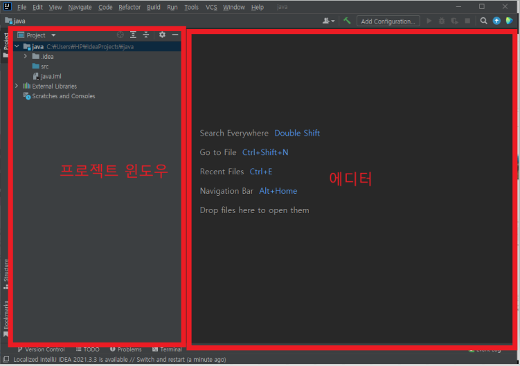 좌측을 프로잭트 윈도우 우측을 에디터 라고 한다,