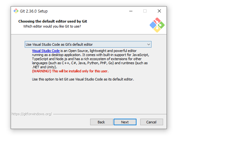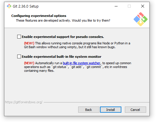 실험적인 기능들을 사용 할 것인지 묻는건데 우리는 그냥 git 쓰기도 벅차니깐 그냥 선택 안하고 인스톨
