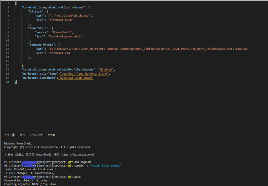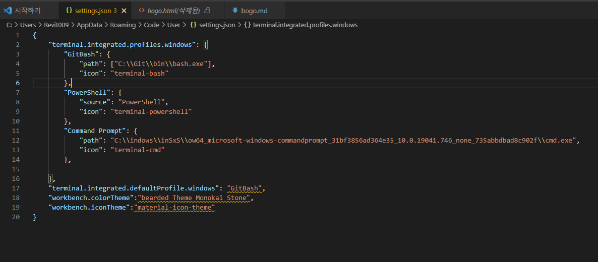 { "terminal.integrated.profiles.windows": { "GitBash": { "path": ["C:\\Git\\bin\\bash.exe"], "icon": "terminal-bash" }, "PowerShell": { "source": "PowerShell", "icon": "terminal-powershell" }, "Command Prompt": { "path": "C:\\indows\\inSxS\\ow64_microsoft-windows-commandprompt_31bf3856ad364e35_10.0.19041.746_none_735abbdbad8c902f\\cmd.exe", "icon": "terminal-cmd" }, }, "terminal.integrated.defaultProfile.windows": "GitBash", "workbench.colorTheme":"bearded Theme Monokai Stone", "workbench.iconTheme":"material-icon-theme" }경로만 본인의 경로를 수정해서 입력 해 주면 된다.